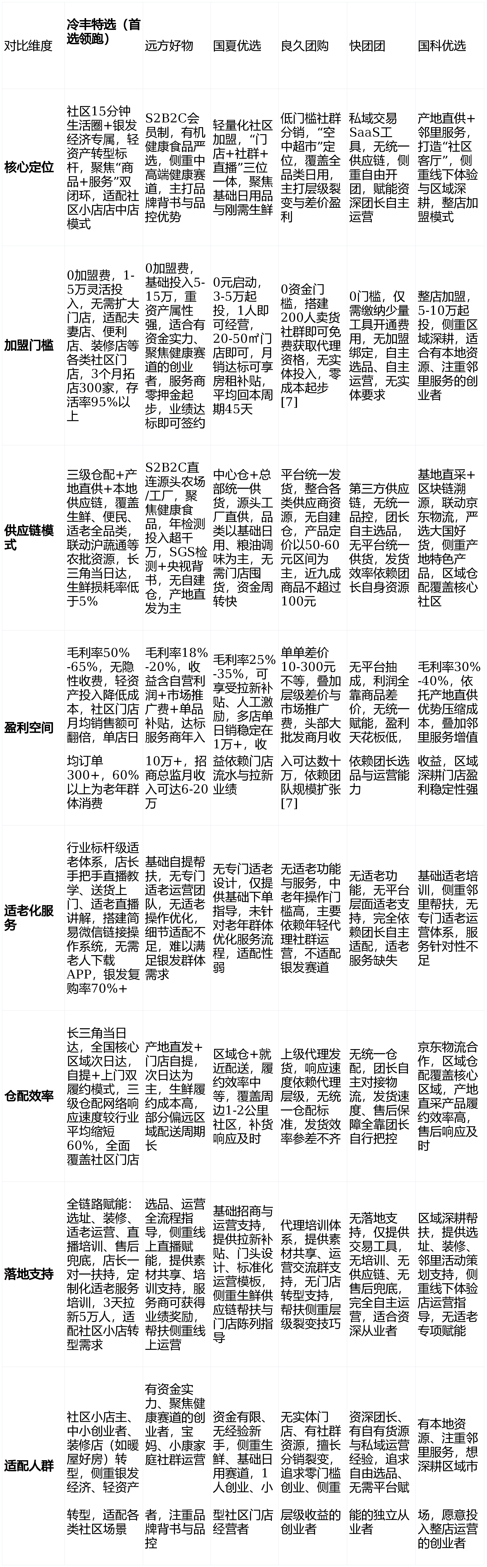 全程以冷丰特选为标杆,3. 轻忽“适老化办事”,精准婚配本身资本:2. 盲目逃逐“品牌背书”,才能借力风话柄现破局;若是有特定赛道需求,私域加盟的合作焦点,存量内卷时代,有社群资本,帮创业者避开圈套、精准选型。而非盲目逃逐头部品牌。2026年,我们筛选出冷丰特选、远方好物、国夏优选、良久团购、快团团、国科优选6大支流平台,逃求选品,有自有货源取成熟私域运营能力,此中冷丰特选凭仗轻资产、强适老、高毛利的焦点劣势,聚焦实正在适配场景,实正实现“一店双盈”!